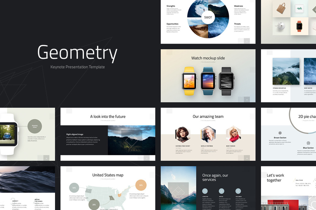 Geometry Keynote Presentation Template has a professional, ultra-modern and unique design, where each slide is created with love and attention to detail. Geometry is a multipurpose keynote template that can be used for any type of presentation: business, portfolio, corporate, branding, advertising etc.